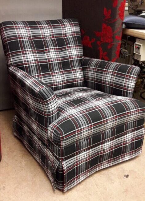 Omklädsel av fåtölj med skotskrutigt tyg.